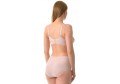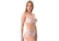 Бюстгальтер эластичный, без каркасов, с боковыми пластинами. Чашки бюстгальтера из тисненного трикотажного полотна и вышитого кружева, на подкладке. Боковая деталь из эластичного полотна, на подкладке. Все срезы бюстгальтера обработаны эластичной отделочной лентой. Бретели эластичные, регулируемые. Застежка сзади на крючки и петли. Отделка три бантика.