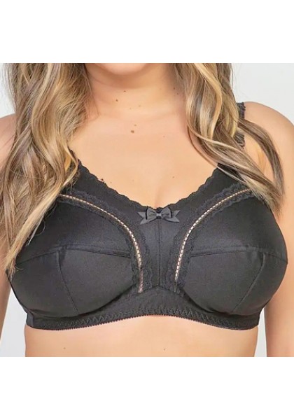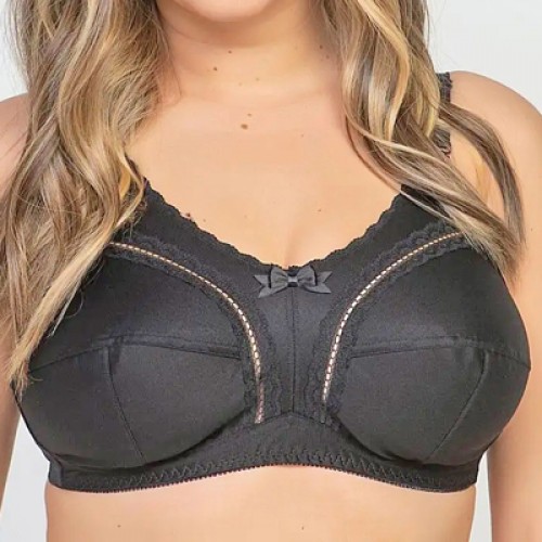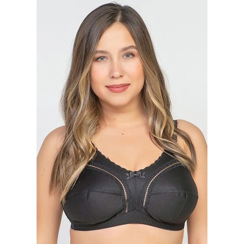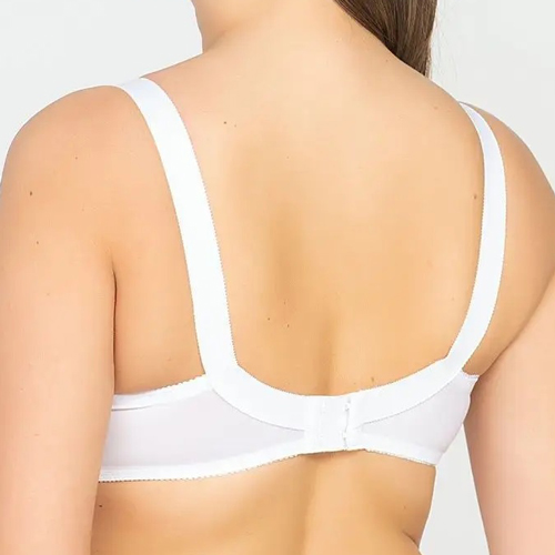 обработан косой хлопчатобумажной бейкой. Верхний срез бюстгальтера обработан узким кружевом. Нижние и боковые