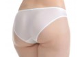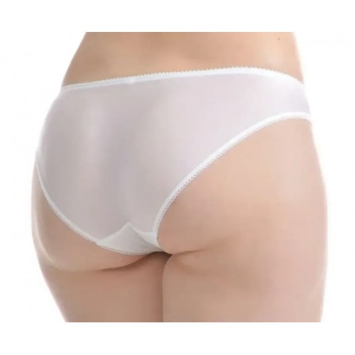 Трусы из эластичного полотна с низкой посадкой. Впереди - вставки из нежного кружева. Ластовица из хлопчатобумажного полотна. Все срезы обработаны эластичной декоративной лентой. Отделка - атласный бант.