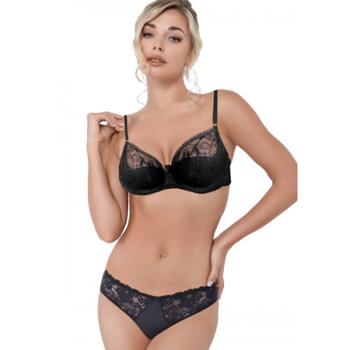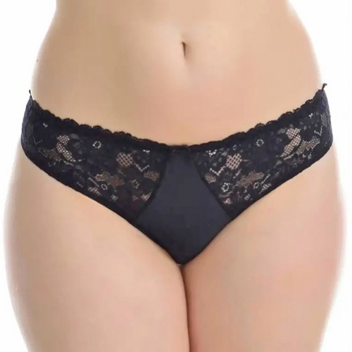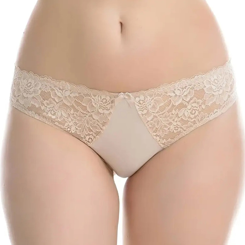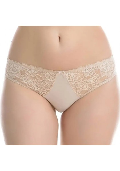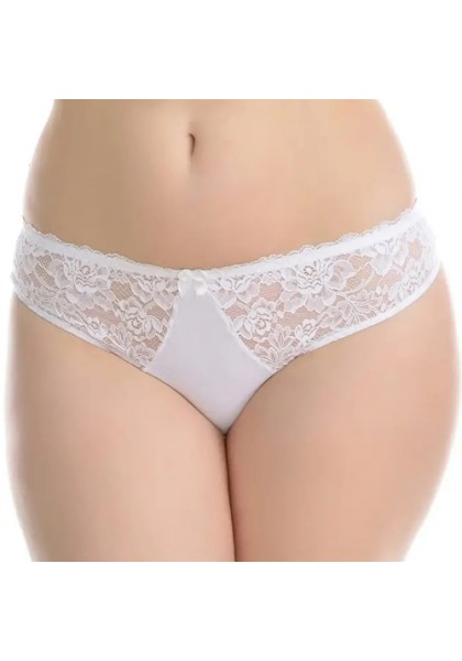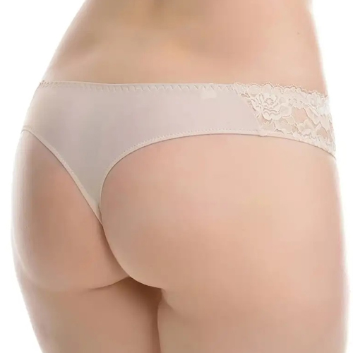 Трусы–стринги из нежного эластичного полотна  декорированы двумя симметричными боковыми деталями из эластичного кружева с цветочным мотивом, которые переходят на заднюю деталь. Срезы трусов обработаны эластичными отделочными лентами. Ластовица на подкладке из хлопчатобумажного трикотажного полотна. Отделка - бантик.